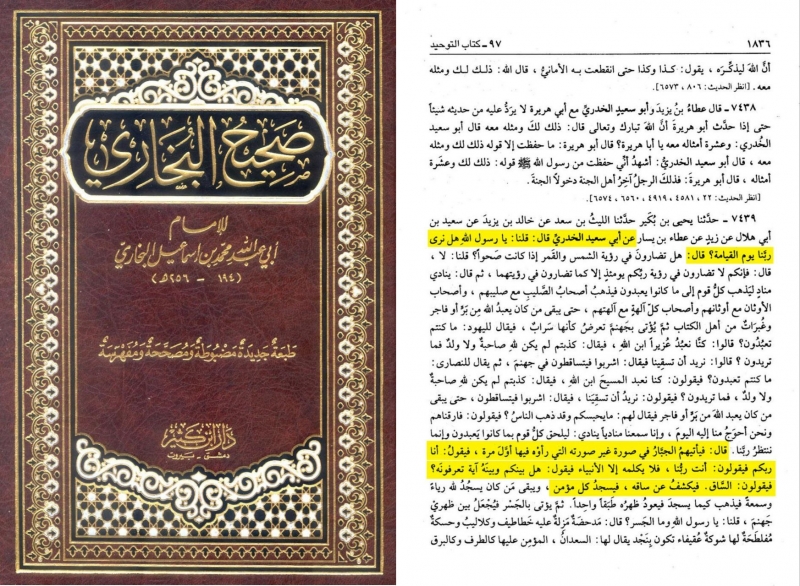 Əbu Səid əl-Xudri dedi: “Biz dedik: “Ey Allahın Rəsulu! Qiyamət günü Rəbbimizi görəcəyikmi?” .... O dedi: “Sonra Cəbbar (Allah) onlara ilk dəfə gördükləri surətdən fərqli bir surətdə gələr və deyər: “Mən sizin Rəbbinizəm”. Onlar deyərlər: “Sən bizim Rəbbimizsən”. Peyğəmbərlərdən başqa heç kim Onunla danışmaz. Sonra (Allah) deyər: “Sizinlə Onun arasında Onu tanıdığınız bir əlamət varmı?” Onlar deyərlər: “Baldır”. Sonra O, baldırını açar və hər bir mömin Ona səcdə edər..”